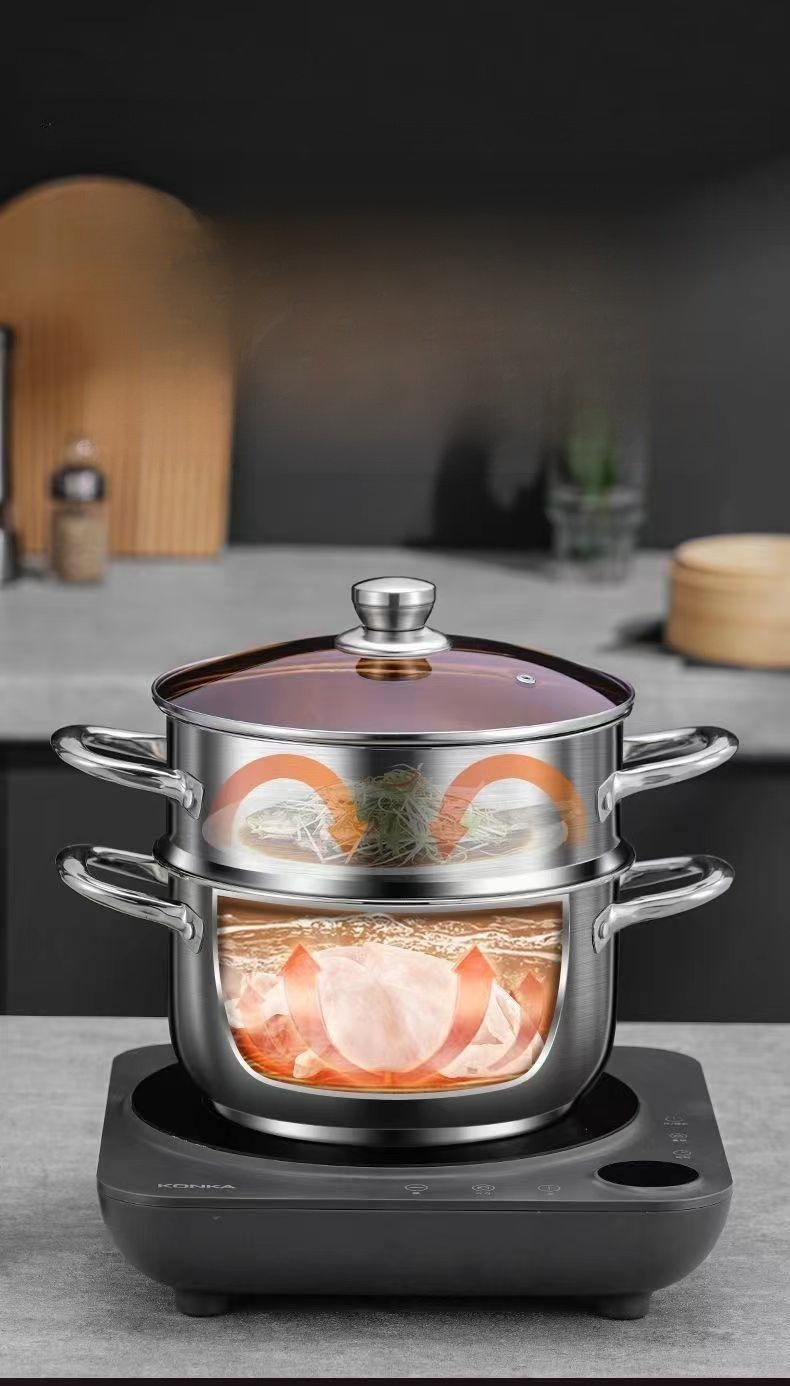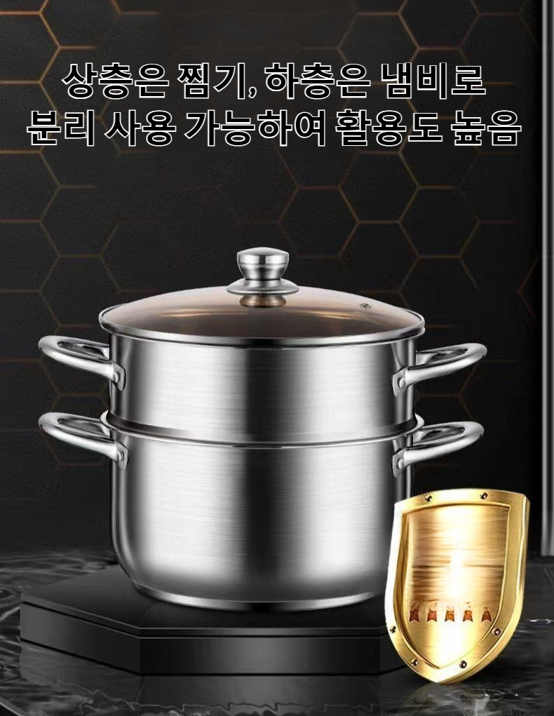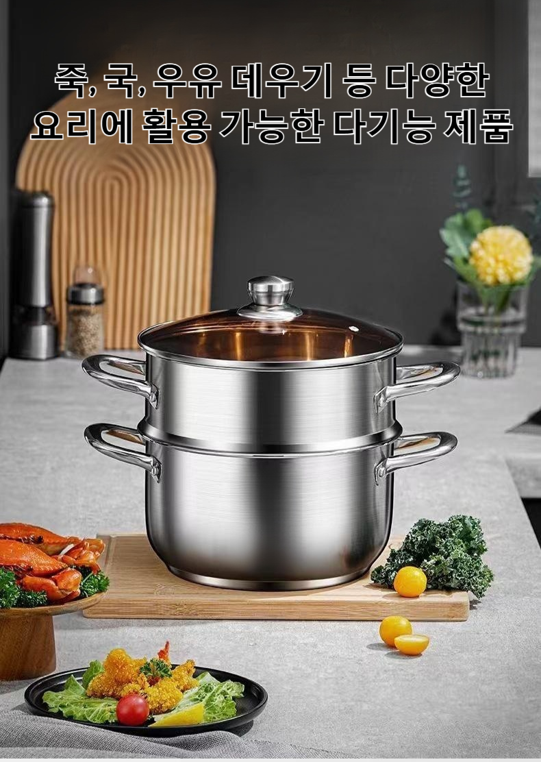 대용량 스티머로 한 번에 많은 음식 조리 가능, 2중 구조로 효율적인 찜 요리, 스테인리스 소재로 내구성 우수, 간편한 세척, 다양한 요리 활용 가능